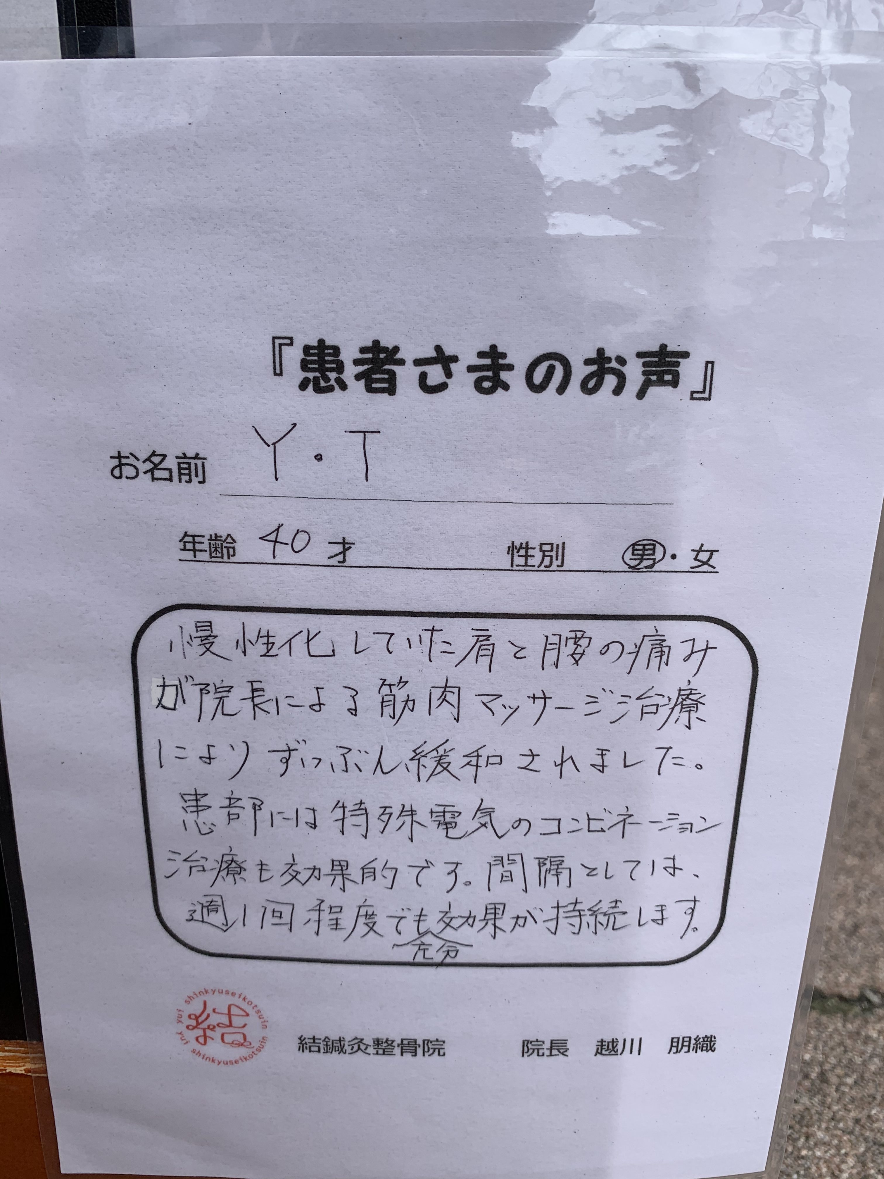 「慢性化していた肩と腰の痛みが院長による筋肉マッサージ治療によりずいぶん緩和されました。