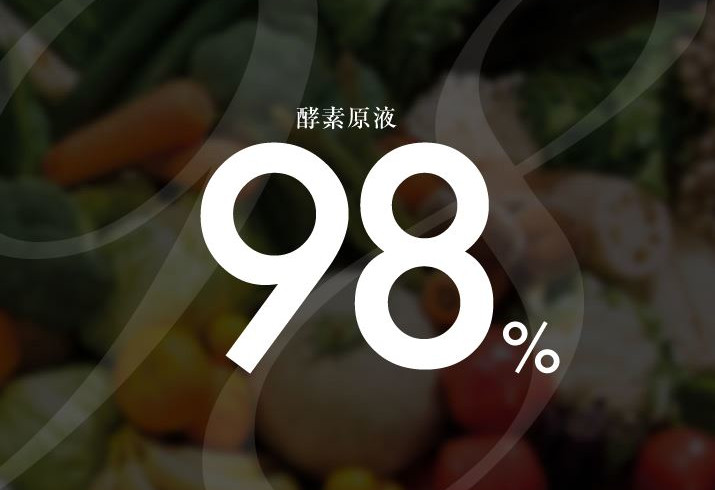 「水」や「オリゴ糖エキス」などの液体や「発酵促進剤」を加えて薄めることなく、伝統製法により無希釈のまま発酵・熟成させた植物酵素原液を、98%も高配合。